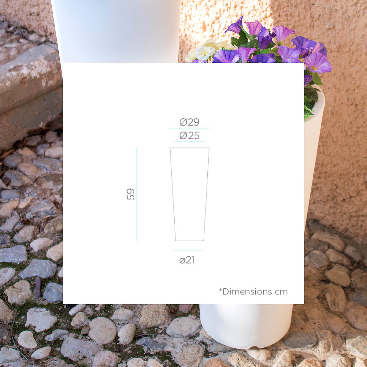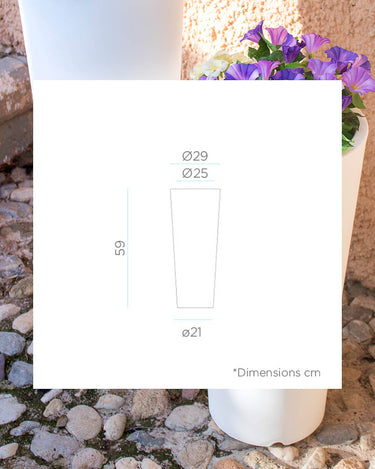FICUS (ø29x59 cm): Es una maceta cilíndrica con una amplia base de plantación. Su altura y ligereza te permite tener una maceta de gran tamaño con un diseño que combina con tus espacios a decorar. Disponible en varios colores.
