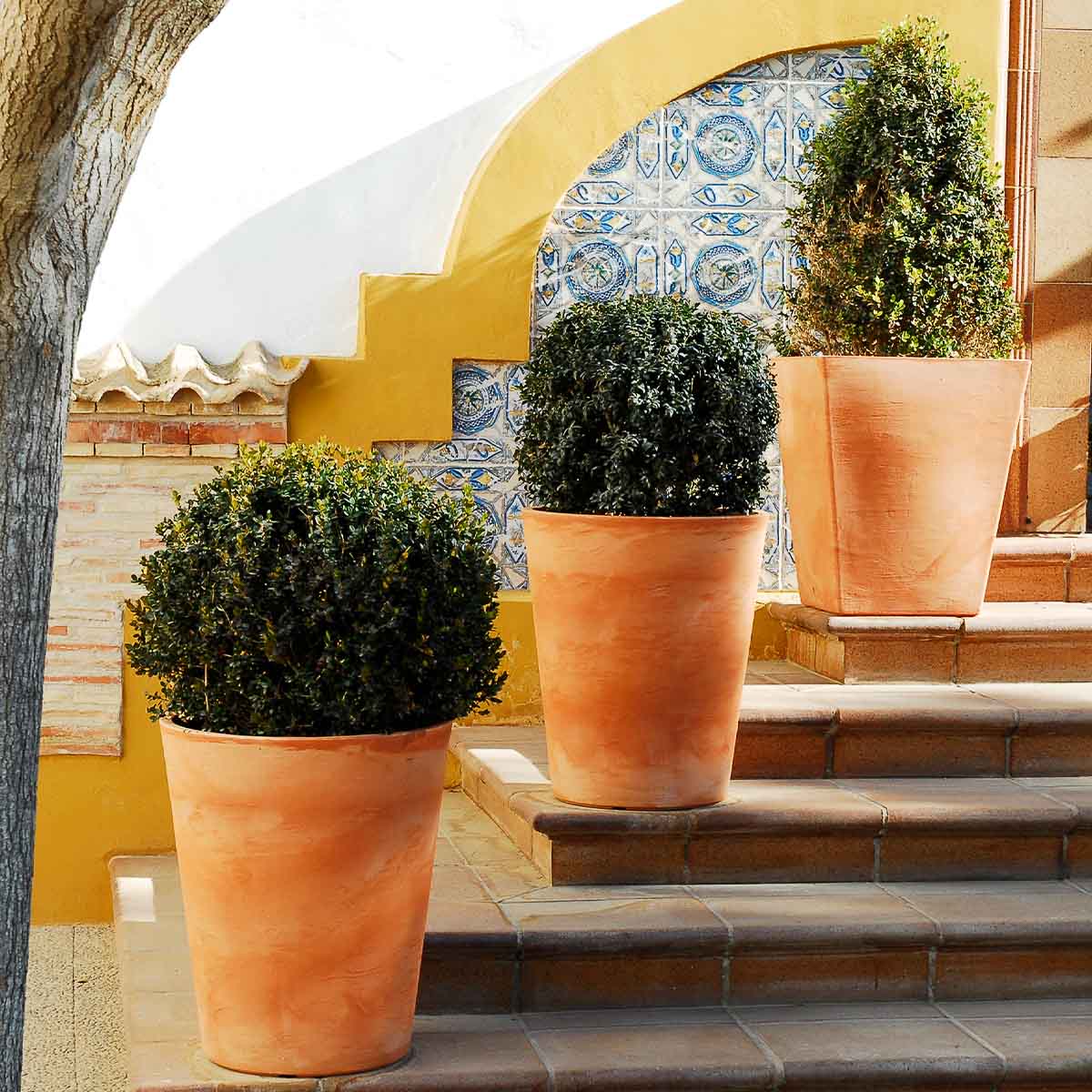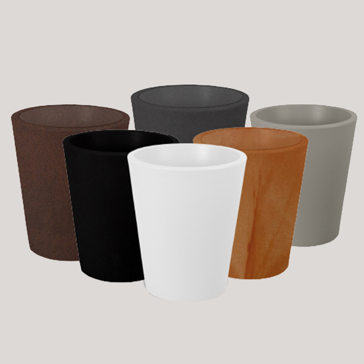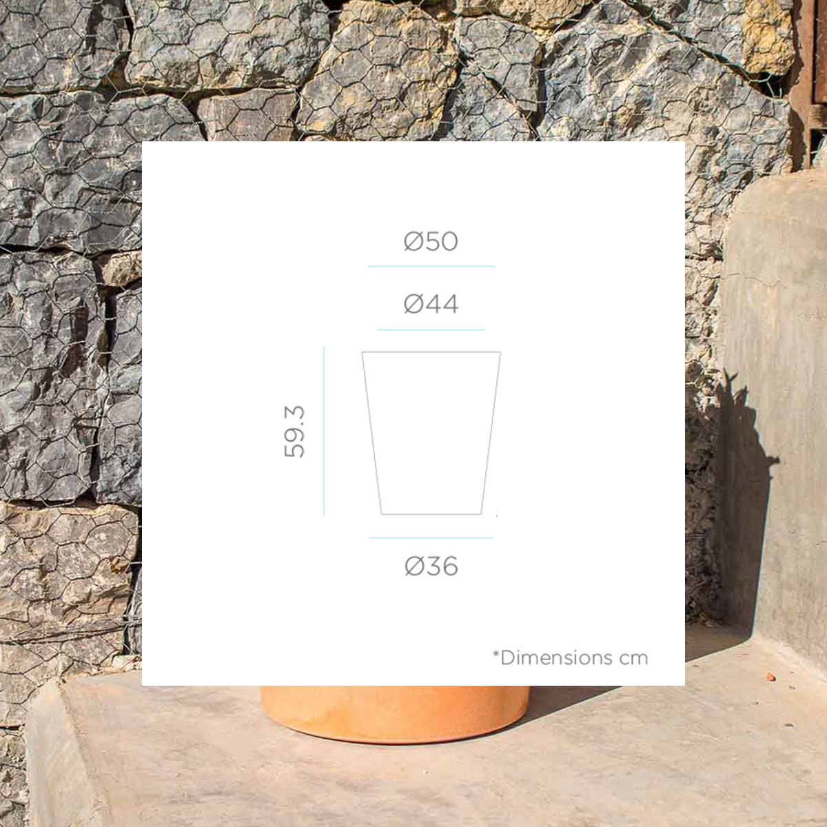 GERBERA 50 (ø50x59 cm): Es una maceta coniforme con una base amplia de plantación. Disponible en varios tamaños, colores y texturas.