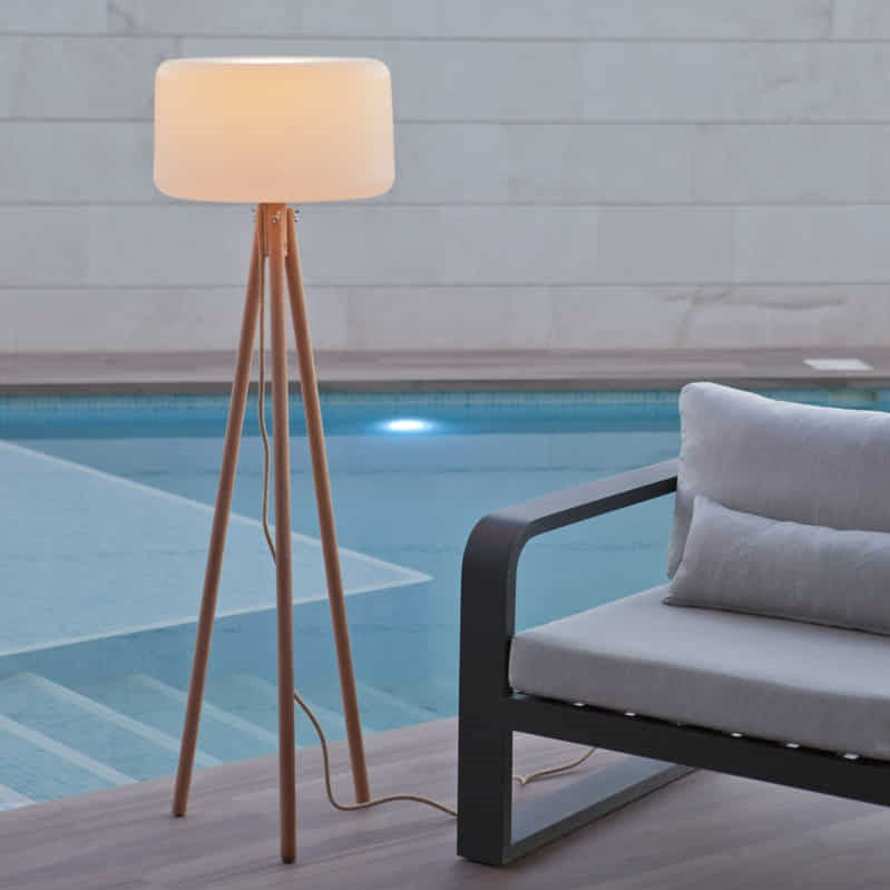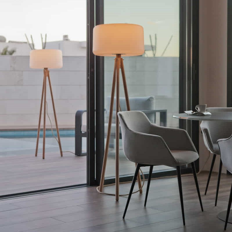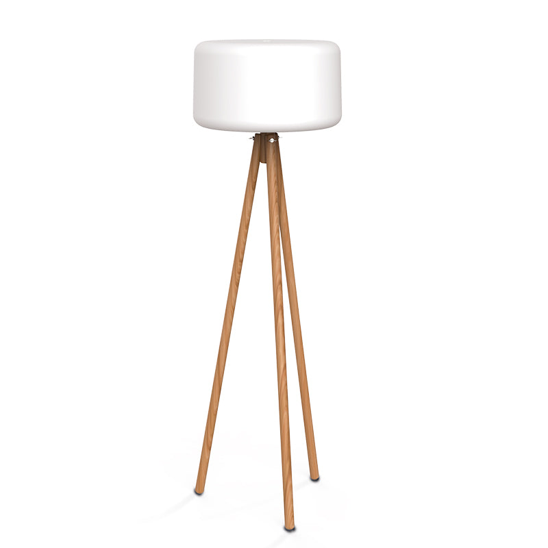 Chloe 140 es un original lámpara de pie con patas de madera ideal para ambientar tanto el exterior como interior de tu casa. Su combinación de madera y Polietileno hace de este producto un indispensable dentro del hogar. Disponible el acabado In & Out, que incluye mando a distancia con regulador de intensidad, cambio de temperatura del color de luz.